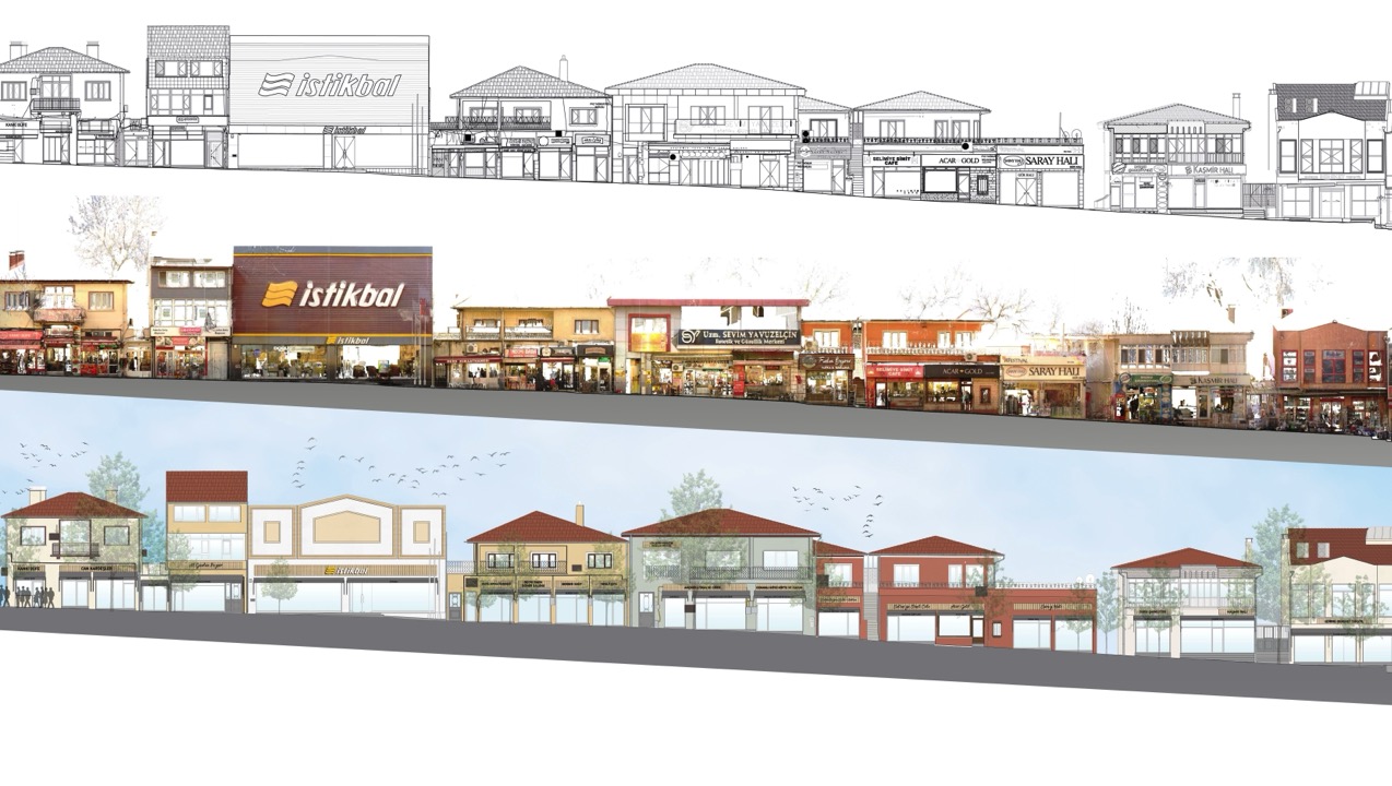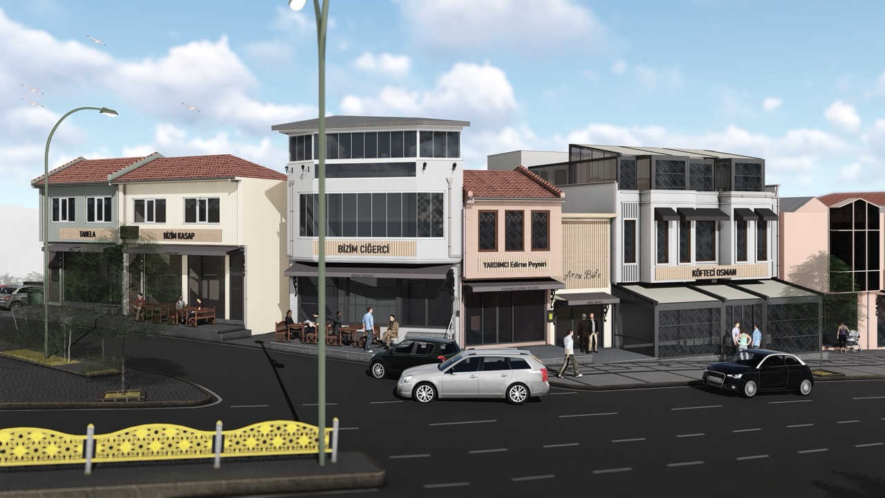 Edirne İli Kıyık Caddesi üzerinde Dünya Kültür Miras Listesi’nde yer alan Selimiye Camii’ne bakı veren binaların cephelerinin iyileştirilmesine yönelik rölöve, uygulama/tadilat, kesin ve detay projeleri üretilmiştir. Kıyık Caddesi üzerinde bulunan dükkanların cephelerinde kullanılan doğramaların bütüncül bir mimari karakteri olması hedeflenmiştir. Dükkanlardaki tüm isim ve reklam panolarının çevre karakterini bozması ve yapıların algılanmasını engellemesi tasarımda belirleyici olmuştur.